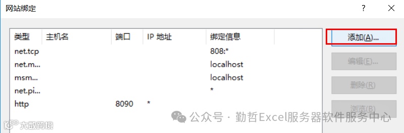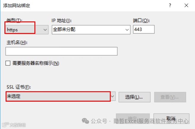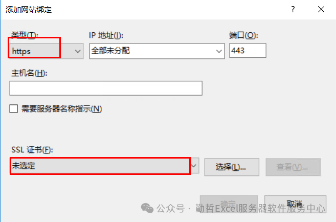 5.在网站绑定页面,点击“添加...”按钮,类型选择https,SSL证书选择刚才导入的证书,点击"确定"按钮。