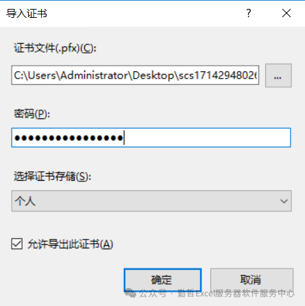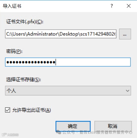 3.导入“server.pfx”证书文件,密码输入“keystorePass.txt”文件内的密码,然后点击“确定”。