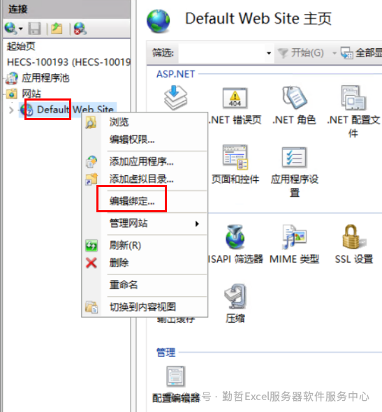 4.鼠标右键点击目标站点(这里以默认站点为例),选择“编辑绑定”。