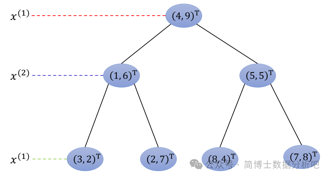 (1)在 树中找出包含目标点 的叶结点:从根结点出发,递归地向下访问 树。若目标点 当前维的坐标小于切分点的坐标,则移动到左子结点,否则移动到右子结点。直到子结点为叶结点为止。