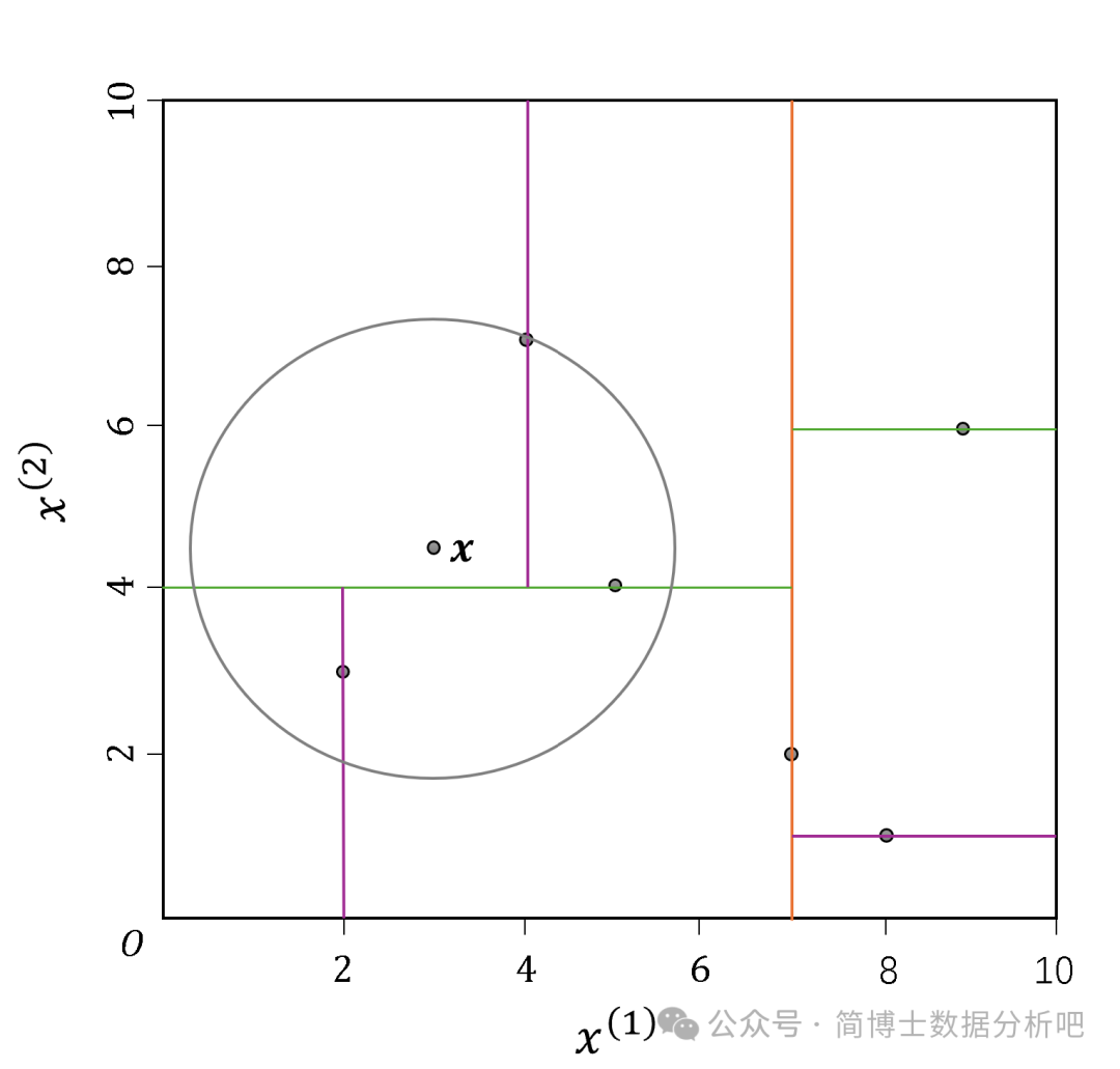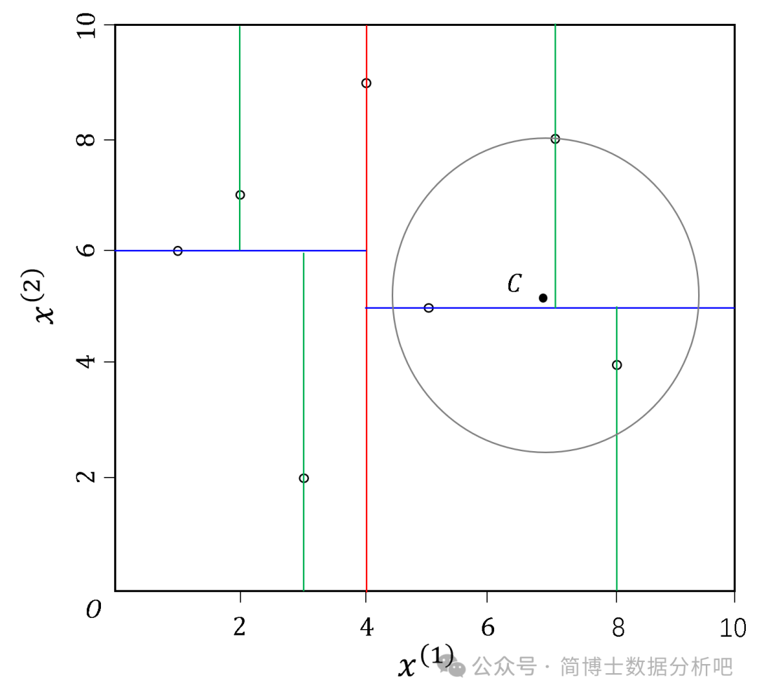 (b) 检查该子结点的父结点的另一子结点对应的区域是否有更近的点。具体地,检查另一子结点对应的区域是否与以目标实例 为球心,“当前 近邻”中与目标实例 最远的距离为半径的超球体相交。如果相交,可能在另一个子结点对应的区域内存在距目标点更近的点,移动到另一个子结点。接着,递归地进行近邻搜索;如果不相交,向上回退。