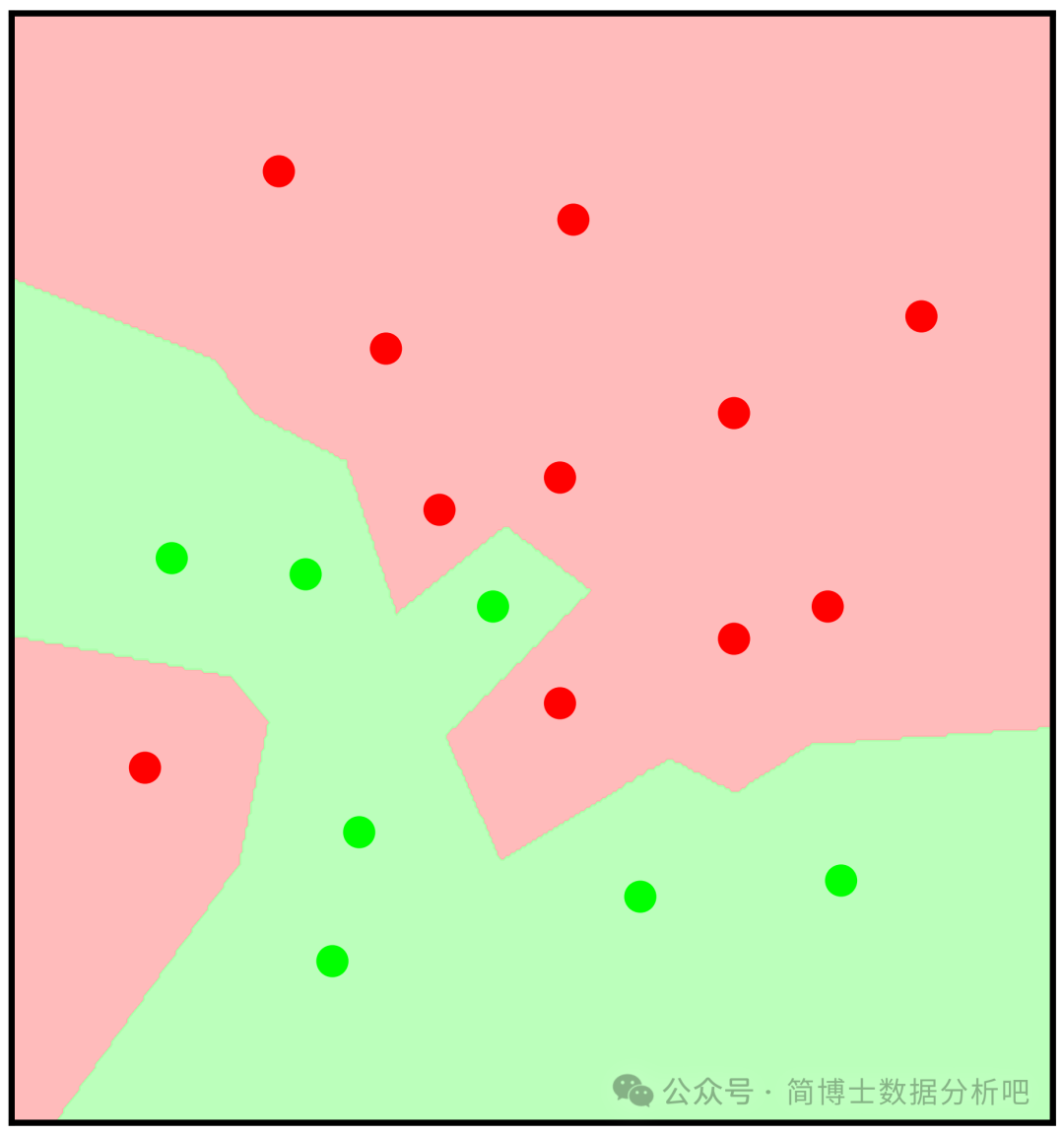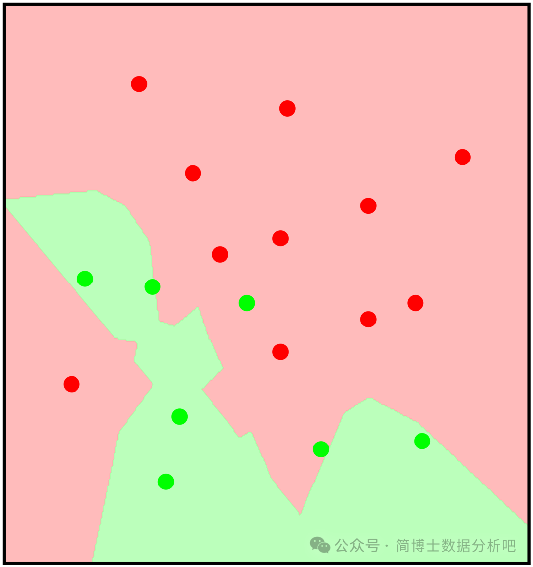 仔细观察可以发现, 时决策边界较为复杂,呈现更多的锯齿状,这是因为每个测试点都依赖于最近的一个训练点,很容易受到噪声的影响,导致过拟合; 时决策边界略显平滑一些,因为每个测试点的分类依赖于最近的两个训练点,边界变得稍微稳定,且减少了对局部噪声的敏感性。
