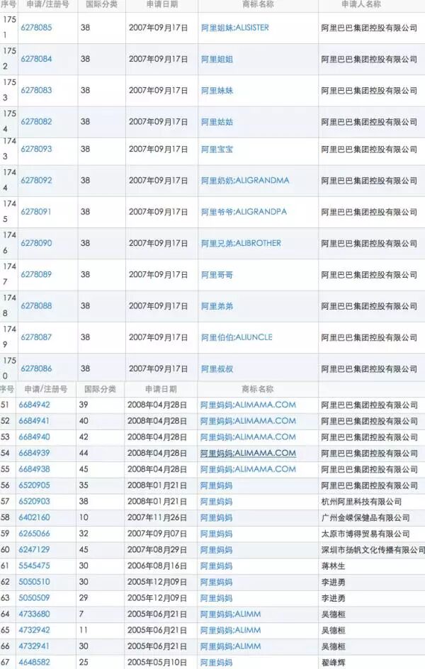 阿里巴巴集团控股有限公司注册了“阿里爸爸;ALIPAPA”、“阿里妈妈”、“阿里妈妈;ALIMAMA.COM”、“阿里姐姐”、“阿里妹妹”、“阿里姑姑”、“阿里叔叔”、“阿里哥哥”、“阿里弟弟”等商标。
