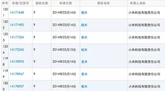 小米科技有限责任公司注册了“大米”、“蓝米”、“黑米”、“紫米”、“橙米”、“绿米”、“黄米”、“桔米”等商标。