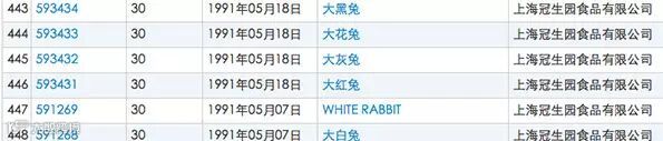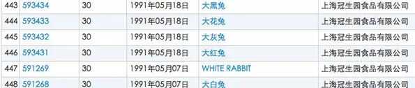 “大白兔”奶糖商标所有者上海冠生园注册的部分防御性商标。本文图片来源:国家工商行政管理总局商标局网站