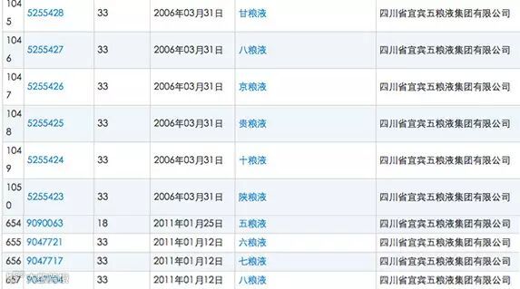 在国家工商总局商标局的商标综合查询系统里,可以查到四川省宜宾五粮液集团有限公司共计持有2064个商标,除了众人所知的“五粮液”,该公司还注册了“六粮液”、“七粮液”、“八粮液”等。在商标国际分类“33”类之下,该公司还注册了“五粮液酒圣”、“五粮液安乐泉”、“五粮液奋进塔”、“五粮液诚信碑”、“五粮液芝麻开花节节高”、“五粮液参天大树”等商标。此外,该公司还注册了以各省简称为前缀的“五粮液”变种,比如“甘粮液”、“京粮液”、“贵粮液”、“陕粮液”等。