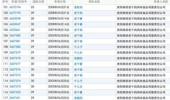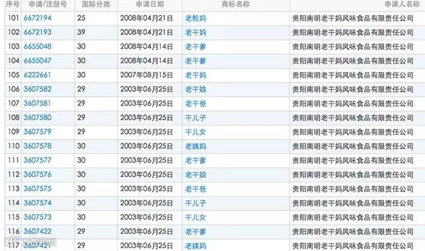 和阿里巴巴类似,公众熟知的油制辣椒品牌“老干妈”所有者贵阳南明老干妈风味食品有限责任公司,还注册了“老干爹”、“老干娘”、“老干爸”、“干儿子”、“干儿女”、“老姨妈”等商标。