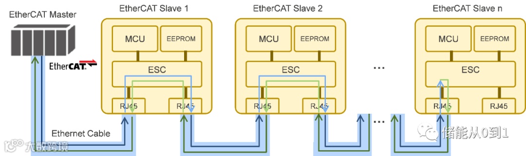 协调控制器需要把功率控制指令下发给PCS,在《大储与工商储区别之:协调控制器》中,我们谈到大规模储能电站通常由成百上千个PCS组成,为了确保各PCS出力的同步和迅速响应,需要采用高效的通信方法。如果采用一问一答的通信方式,例如Modbus RTU协议, 把信令下发到所有的PCS则可能已经过了几分钟甚至几十分钟,这是不可以接受的。因此,通常需要采用更快捷的通信方式,例如采用广播的方法,或者采用IEC61850/GOOSE、EtherCAT等实时通信协议,保证通信的实时性。以下附上一张IEC61850的通信协议栈框架以及EtherCAT的通信原理框图,有兴趣的读者可以深入研究。