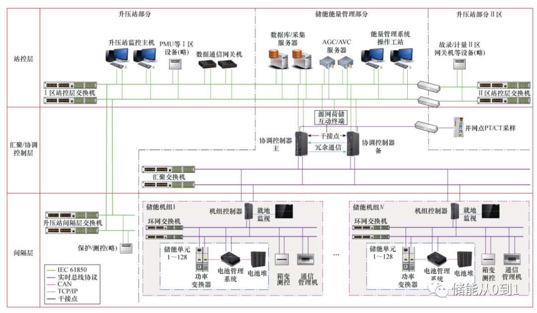 下图是百兆瓦级电化学储能电站的监控网络拓扑结构图(出处:中国电工技术学会的《百兆瓦级电化学储能电站监控及通信技术要求》),可以看到,储能协调控制器是连接站控层和间隔层的关键设备,实现信息的上传和控制信息的下达。一方面,协调控制器可以把储能机组相关的状态信息上传至站控层能量管理系统(也有些系统是通过前置服务器进行上传的),另一方面,它根据并网点的采样信息做出判断,生成控制指令,下发到间隔层的各个机组控制器,对PCS进行控制。此外,能量管理系统的稳态控制指令(AGC和AVC等)也需要通过协调控制器转发到各个机组控制器,避免暂态控制和稳态控制指令的冲突。