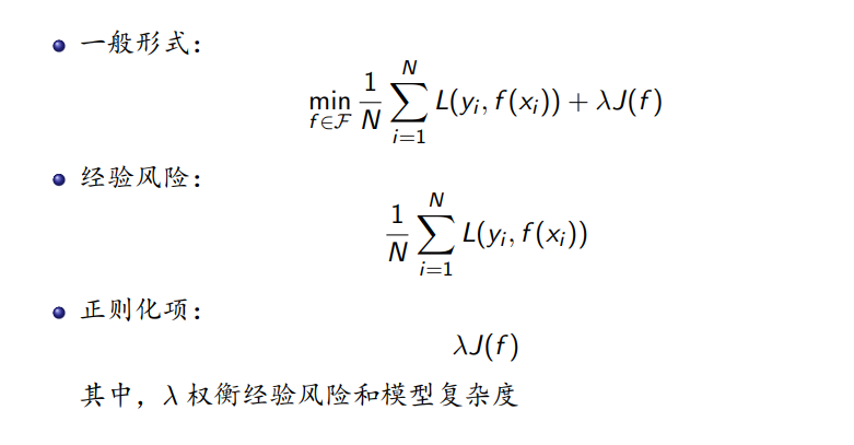 正则化,就是通过使结构风险最小化来实现的。在正则化的一般形式中,目标函数为结构风险。其中,第一部分是经验风险,用以度量模型在训练集中的平均损失,第二部分被称为正则化项或惩罚项,J(f) 度量模型的复杂度,系数 λ,用以调整经验风险和模型复杂度之间的关系。