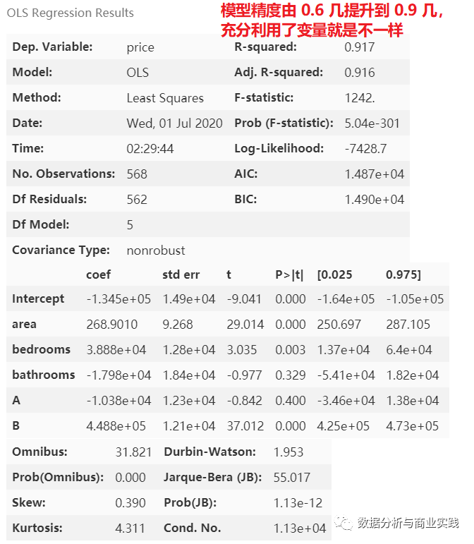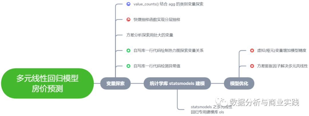 多元线性回归模型作为最基础又最经典的模型之一,用处十分广泛。本文实现了从探索性数据分析到模型建立再到用经典的方法将模型优化的一套通用的流程,具体该添加哪些处理细节和算法,还需要根据实际情况进行考量。至于具体的模型参数和结果该怎么看,本文就不再一一赘述,其中往模型里添加了虚拟变量后该如何对结果进行解释,这一点在文中虚拟变量的链接中已详细地做出了解释。