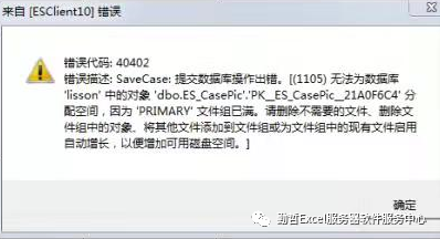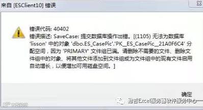 现象:填报保存单据的时候,提示无法为数据库中的对象分配空间,因为'PRIMARY'文件组已满。请删除不需要的文件、删除文件组中的对象,将其他文件添加到文件组或为文件组中的现有文件启用自动增长,以便增加可用磁盘空间。如下图: