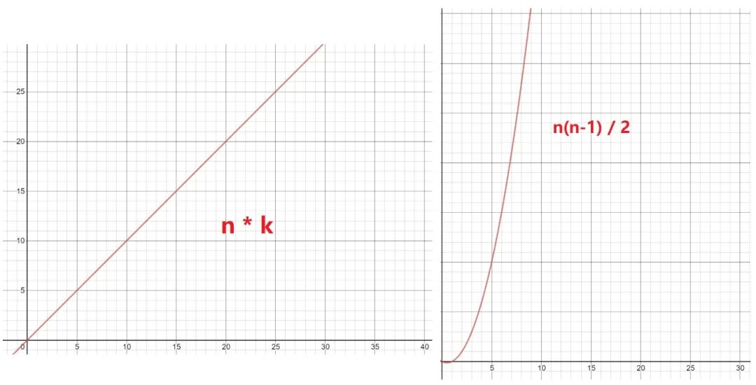 答:对第一步使用层次聚类法的计算次数为:Cn2((C52 = (54)/2)),即计算两两点之间的距离,然后再比较筛选,即:n(n-1) / 2 = 54 / 2 = 10 次,但这只是小的数据样本,如果样本量巨大呢(同样还是 k 为 2 时)?那么 K-Means 的 n*k 与层次聚类法的 Cn2 的复杂度图比较便是: