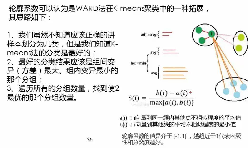 轮廓系数其实非常难求,组内的(a(i))好算,b(i) 非常难计算,而且还要每个点都要同不同组里面的所有点进行计算,所以轮廓系数在实操的时候样本量的大小需要控制,一般几千就行了,几万的话就太难计算了;换言之,轮廓系数一般也是在探索的时候用,比如分层抽样后对 k 的取值进行探索。这也再次呼应了前两段提到的 K-Means 方法的 k 难以直接通过数学公式求得的的这一特点。