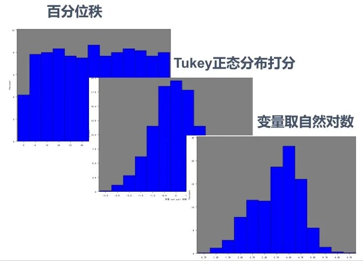非对称变量在聚类分析中选用百分位秩和Tukey正态分布打分比较多;在回归分析中取对数比较多。因为商业上的聚类模型关心的客户的排序情况,回归模型关心的是其具有经济学意义,对数表达的是百分比的变化。