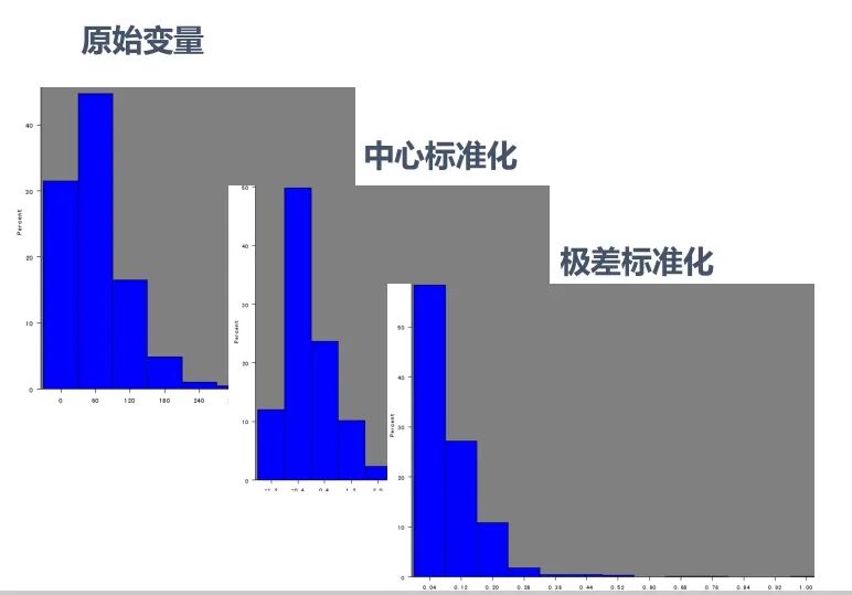 原始数据本来就是右偏的,几种标准化方式之后其实也还是右偏的...,我们在学校学习统计学或聚类方法的时候,所用数据大多是来自自然科学的,所以分布情况都比较“完美”,很少出现较强的偏态分布。而现实生活与工作中的数据,如金融企业等,拿到的数据大多右偏严重。