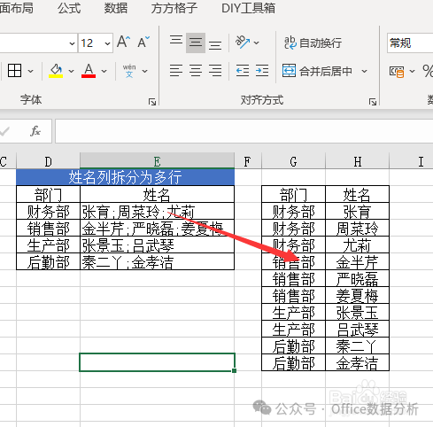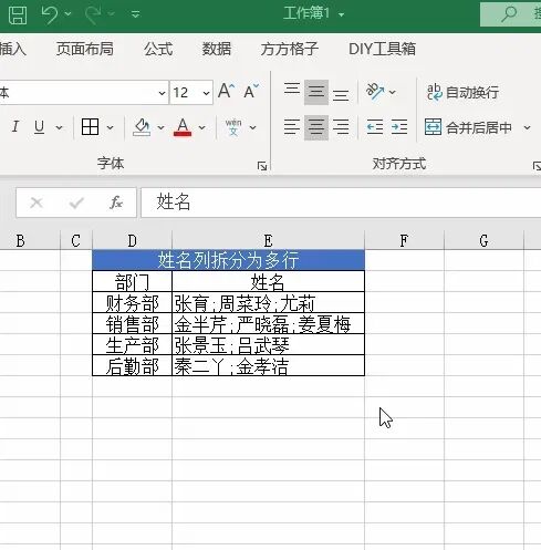 开演示文件,如下图,要求裁互将姓名列多数据拆分为多行显示。