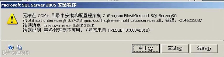 问题:在安装SQL Server2005过程中,出现如下提示:无法在COM+目录中安装和配置程序集C:\Program Files\Microsoft SQL Server\90\NotificationServices\9.0.242\Bin\microsoft.sqlserver.notificationservices.dll。错误:-2146233087