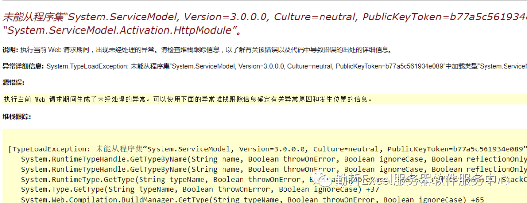 现象:登录esweb报未能从程序集“System.ServiceModel, Version=3.0.0 .0, Culture=neutral, PublicKeyToken=b77a5c561934e089”中加载类型“System.ServiceModel.Activation.HttpModule”。如下图: