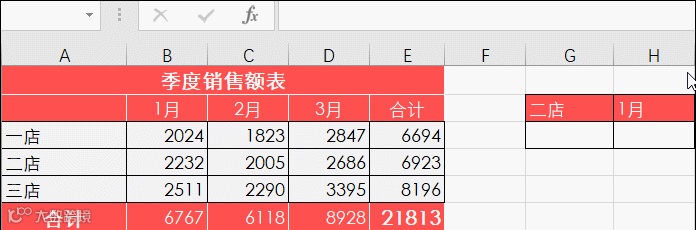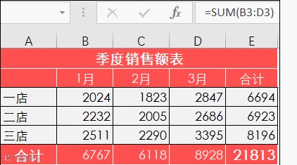 例1:下面是一个常见的季度销售额报表,要求分店和月份的合计,以及最后的合计,就可以使用SUM函数