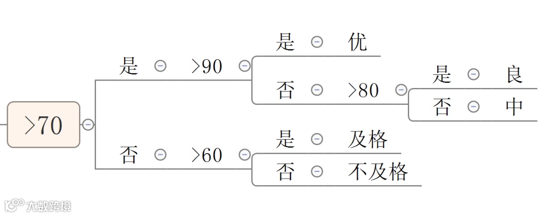 例2:通过学生的分数对其分为优、良、中、及格、不及格五档: