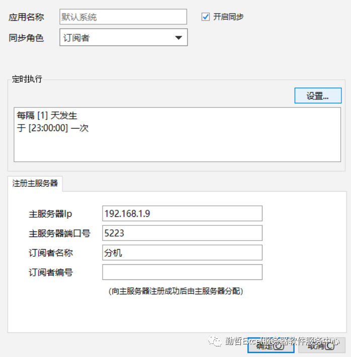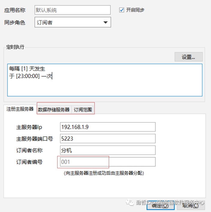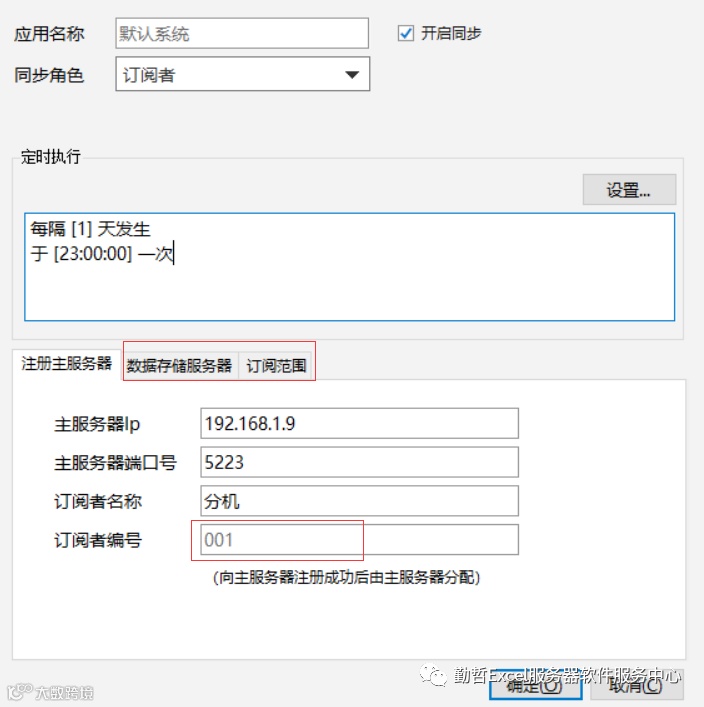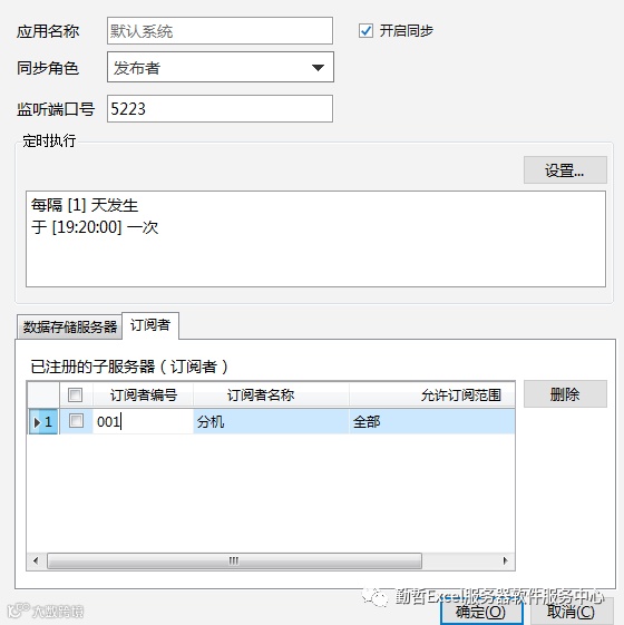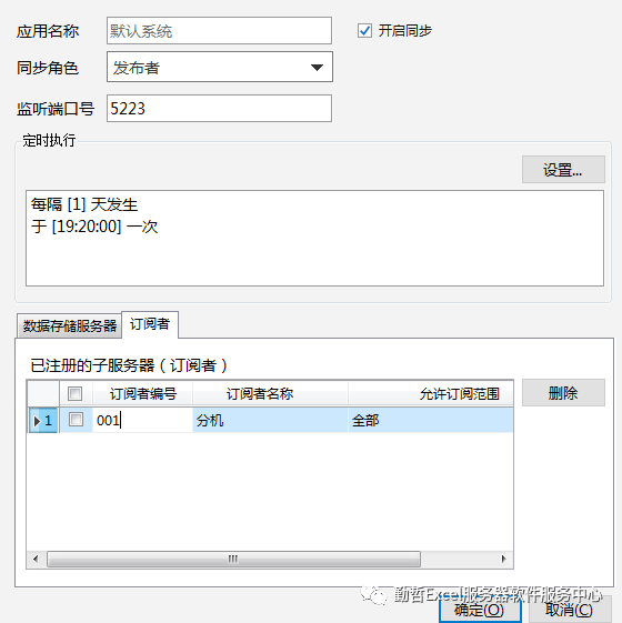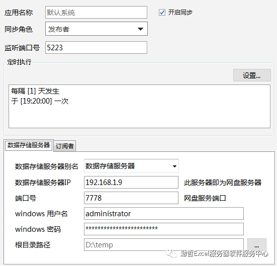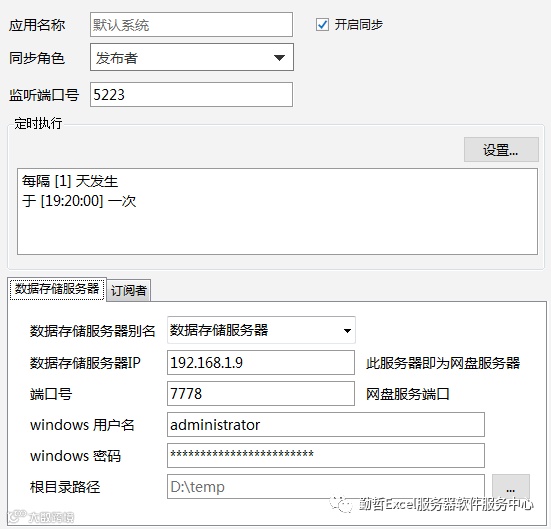 勾选“开启同步”,选择【同步角色】为“发布者”,设置定时执行、数据存储服务器信息。
