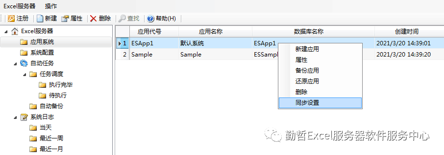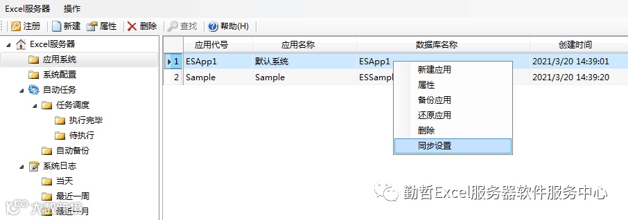 在主服务器A的系统管理台-应用系统的列表选中esapp1应用,单击右键,选择同步设置。
