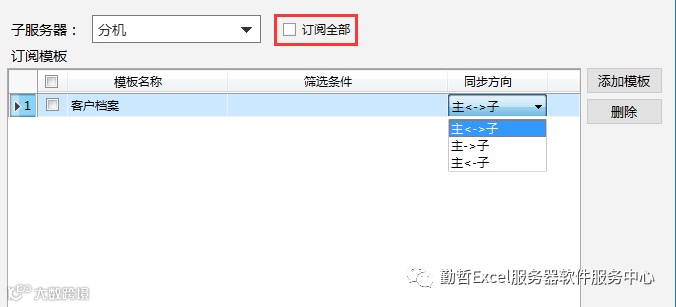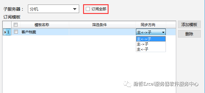 默认勾选【订阅全部】:应用中所有模板都同步,且同步方向为双向。