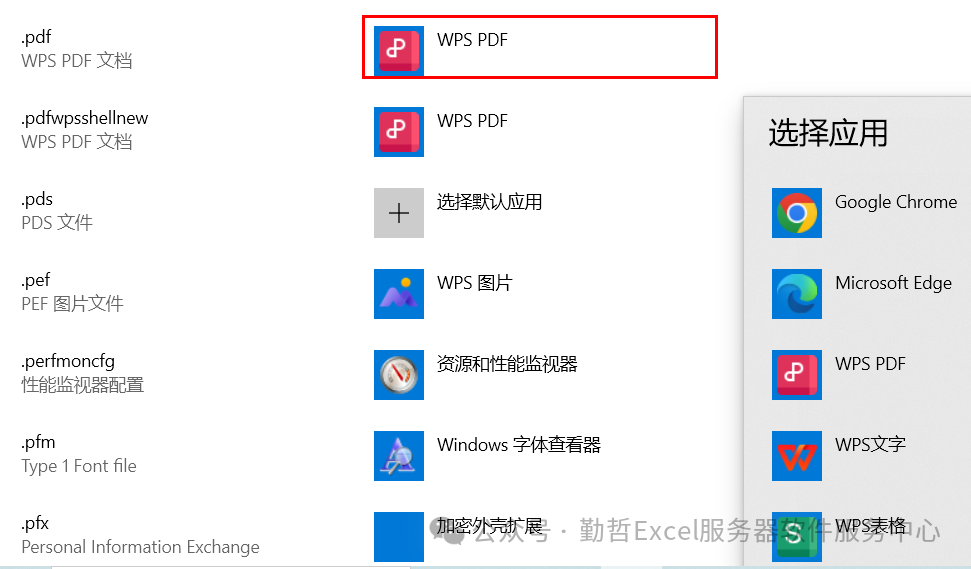 一直向下滚动到“.pdf”。你可能需要向下滚动很长一段时间。找到后,单击当前pdf文件的默认应用,就可以将其更改为其他应用程序。