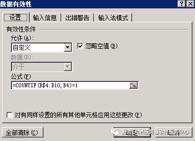 说明:这个公式的含义就是从选定的录入数据区域的第一个单元格开始,利用COUNTIF()函数计算每个单元格的数据在整列中出现的次数,如果出现的次数等于1,那么该公式的返回值为TRUE,输入的数据就是有效的。若出现的次数不等于1,这就意味着输入了重复的数据,那么该公式的返回值为FALSE,输入的数据就是无效的。