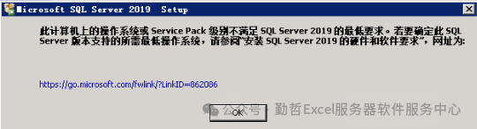 问题:安装SQL Server 2019的时候,提示:此计算机上的操作系统或Service Pack级别不满足SQL Server 2019的最低要求。若要确定此SQL Server版本支持的所需最低操作系统,请参阅"安装SQL Server 2019的硬件和软件要求",如下图。