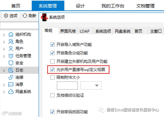 首先,登录客户端后,在系统管理--选项--常规选项卡里面,勾选“允许用户直接写sql定义视图”。