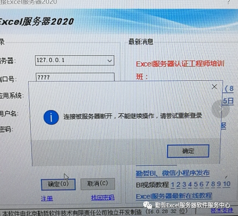场景:在登录勤哲Excel服务器软件时,有时候会遇到这样的提示:连接被服务器断开,不能继续操作,请尝试重新登录。如下图: