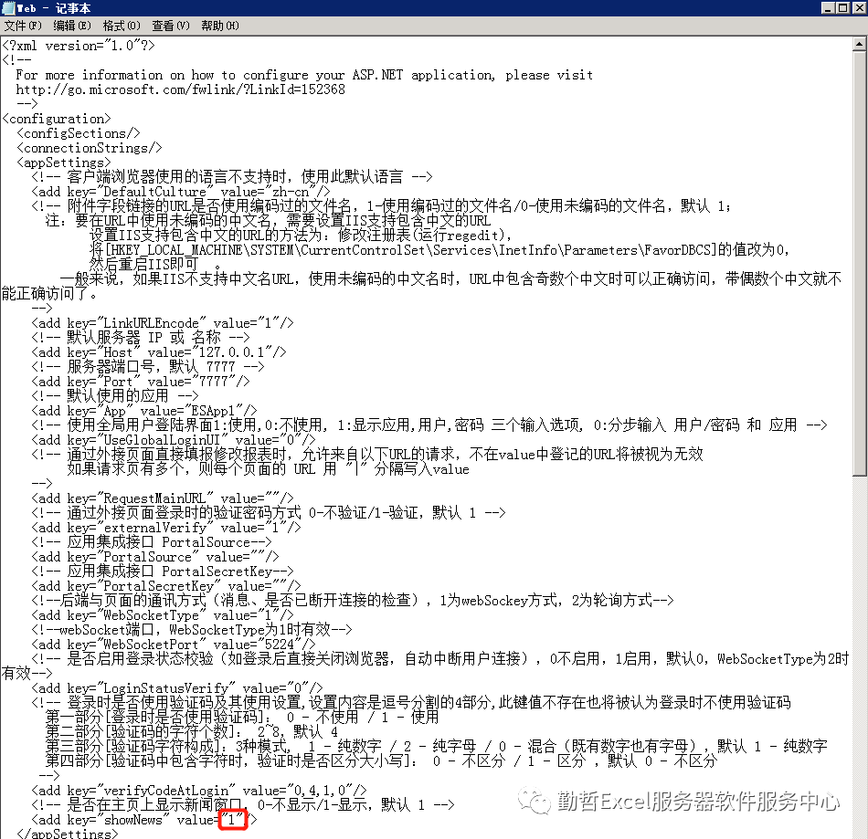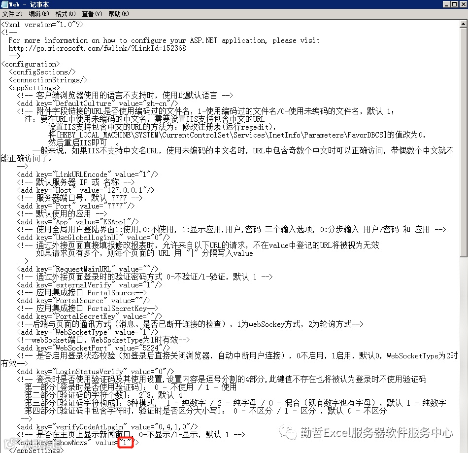 解决:在服务器上找到软件安装目录,如:C:\Program Files\Cesoft\Excel Server 2022\ESWeb,打开这个目录下的配置文件web.config,修改其下面的内容:将value值修改成0即可。