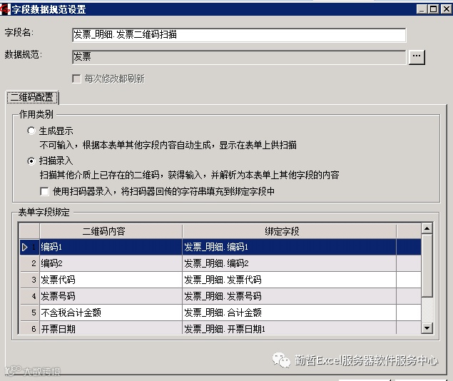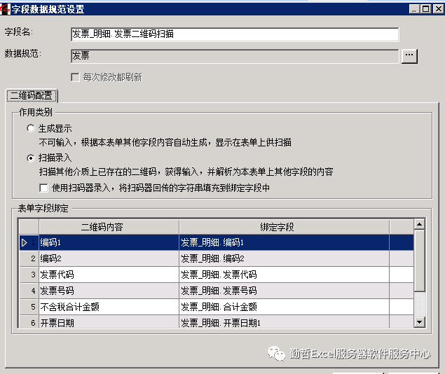 其中:发票二维码扫描字段的数据规范关联刚才定义好的二维码数据类型。