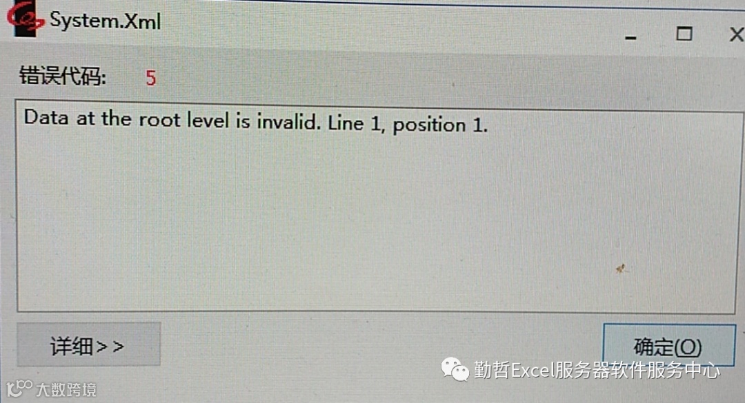 问题:在软件使用过程中时不时会出现这个提示:Data at the root level is invalid. Line 1,position 1.如下图: