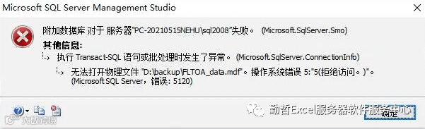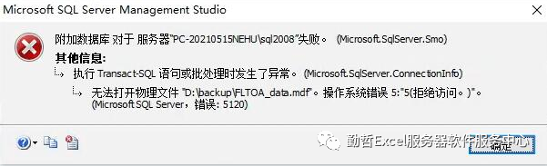 问题:附加数据库的时候提示执行Transact-SQL语句或批处理时发生了异常。(Microsoft SqlServer.ConnectionInfo) 无法打开物理文件。操作系统错误5:"5(拒绝访问。)”。如下图: