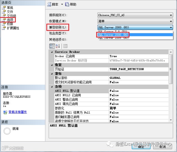解决:通过SSMS进入数据库后台,选中当前使用的应用系统,右键属性找到左侧的“选项”,兼容级别选择“SQL Server 2000(80)”,如下图。