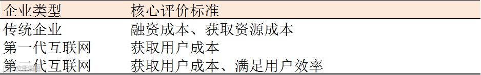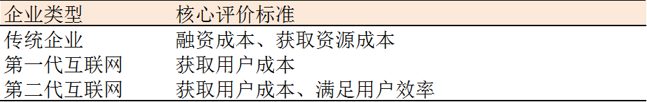 第二代互联网下,评价鹰的核心指标正在改变。如果说传统企业比拼的是融资成本、获取资源的成本;那第一代互联网时代,比拼的则是获取用户的成本;而到了第二代互联网,比拼的则是获取用户的成本,以及满足用户的效率。获取用户成本越低,满足用户效率越高,就越容易胜出。传统的估值体系中,核心假设是公司的稳定增长,核心财务指标(如ROE、财务成本),并不适用处在跑马圈地的第二代互联网企业。