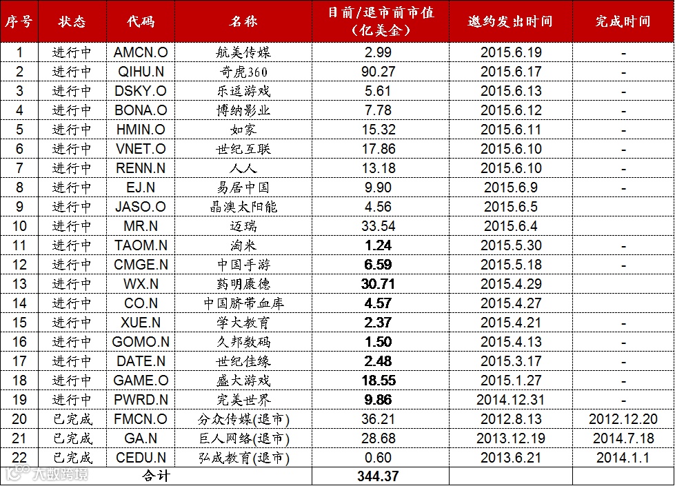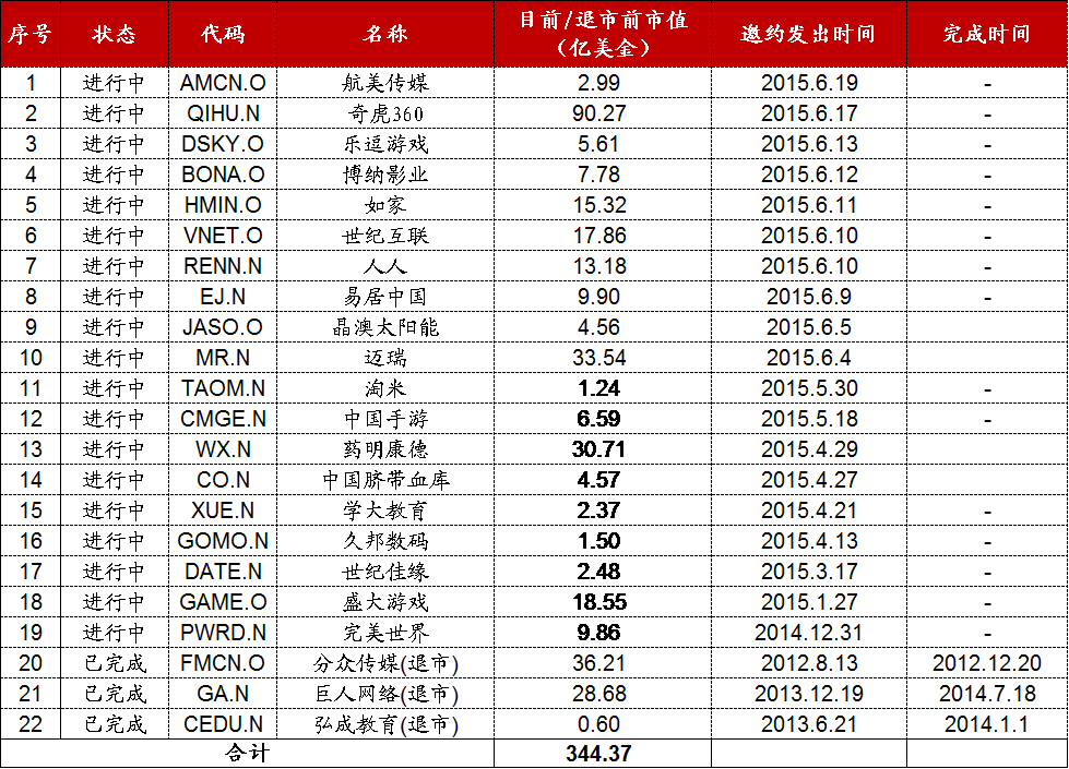 这一轮中国与互联网相关的牛市是一个迭代的过程。一方面,A股原有龙头公司利用泡沫带来的资本优势,加速构建竞争壁垒,实现跨越式发展。另一方面,在牛市初期“抢筹码”效应下,越来越多的优质标的正加速回归。中概股正以平均2天1家的速度公布私有化要约,奇虎360、航美传媒宣布私有化;还有一批拟上市公司正拆除VIE结构,备战A股,好孩子正跑步归来。按照交易进程推算,他们预计于16年陆续登陆。