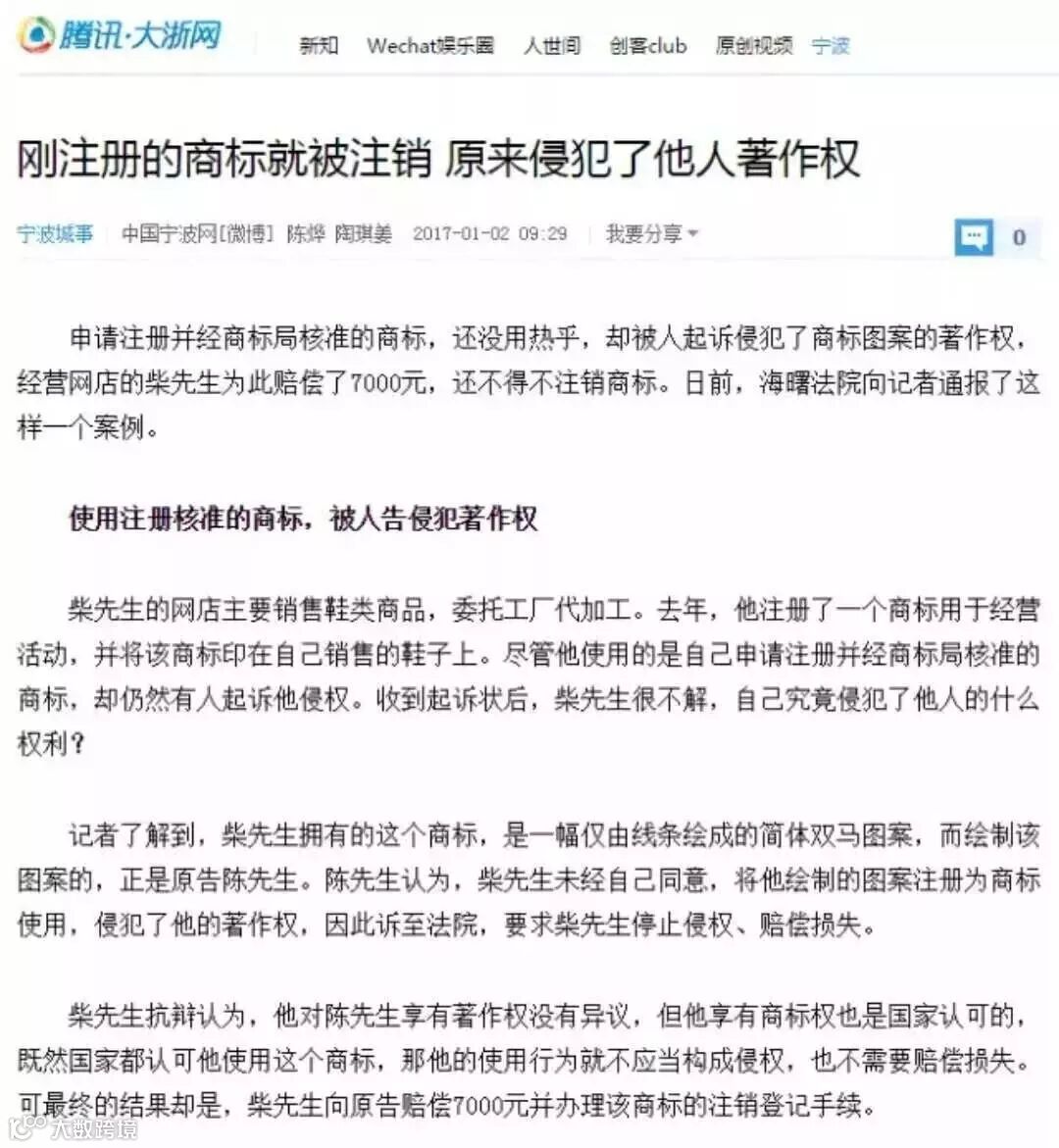 2017年浙江一位经营网店的柴先生,注册了一个商标并已通过商标局核准下证,但没使用多久,却被人起诉侵犯了著作权(即版权),柴先生为此赔偿了7000元,还不得不注销商标。