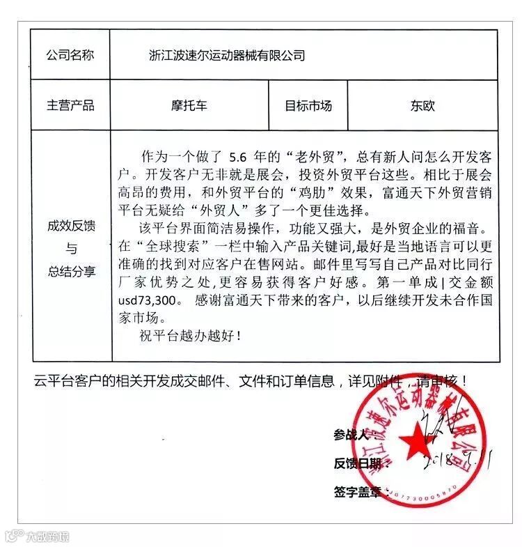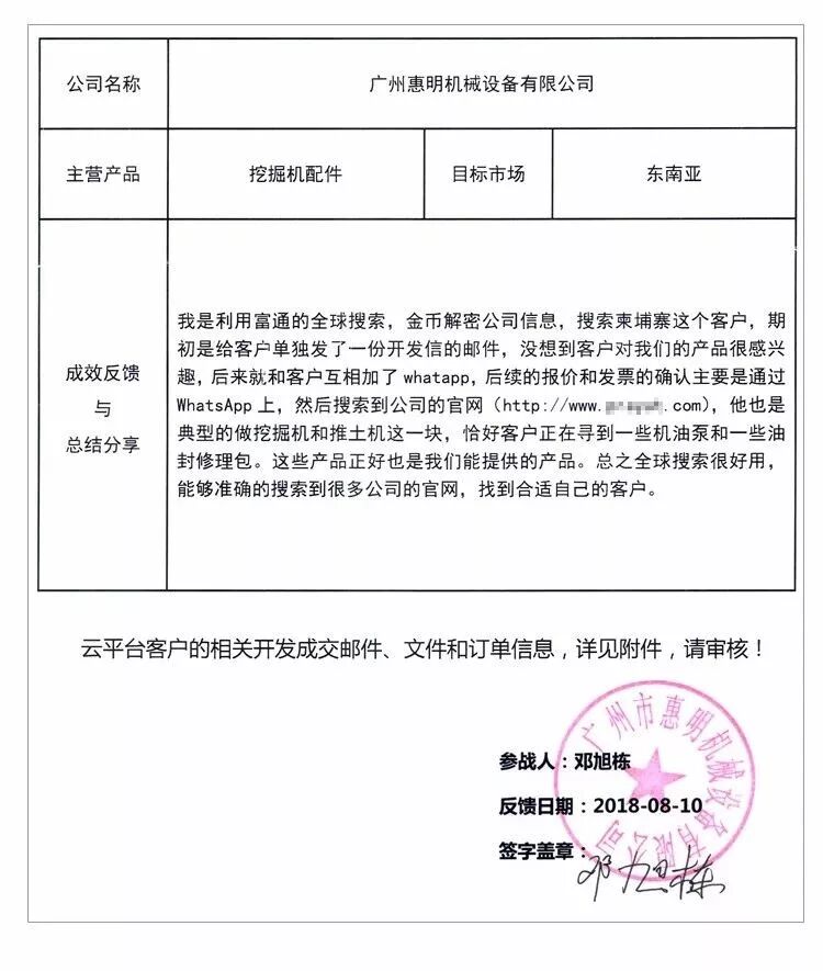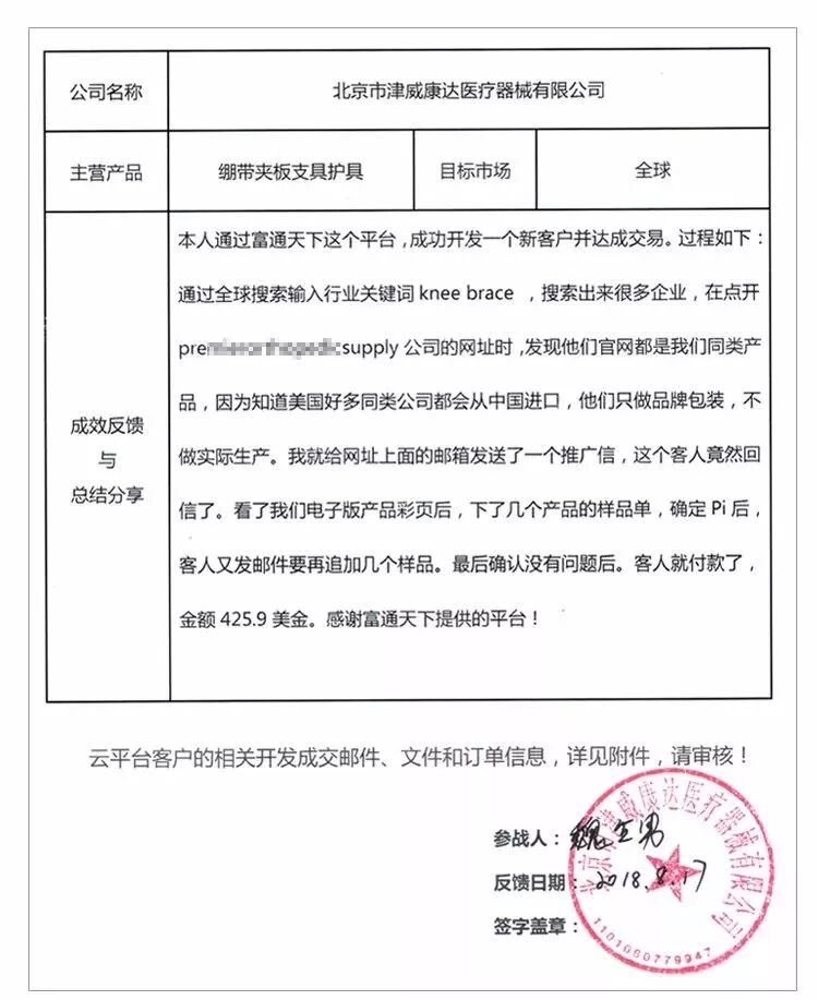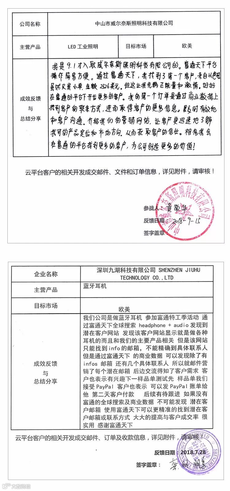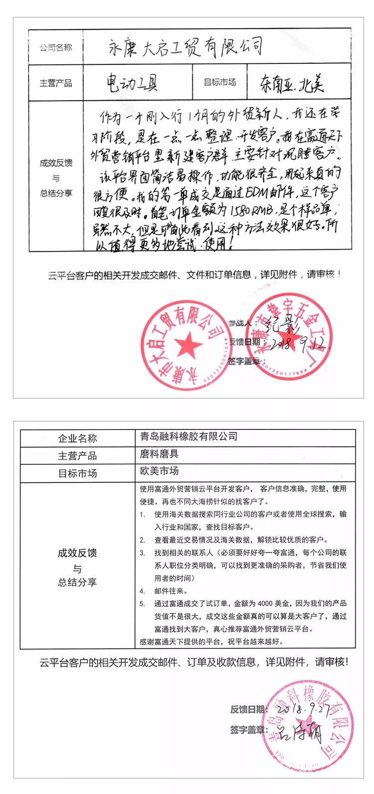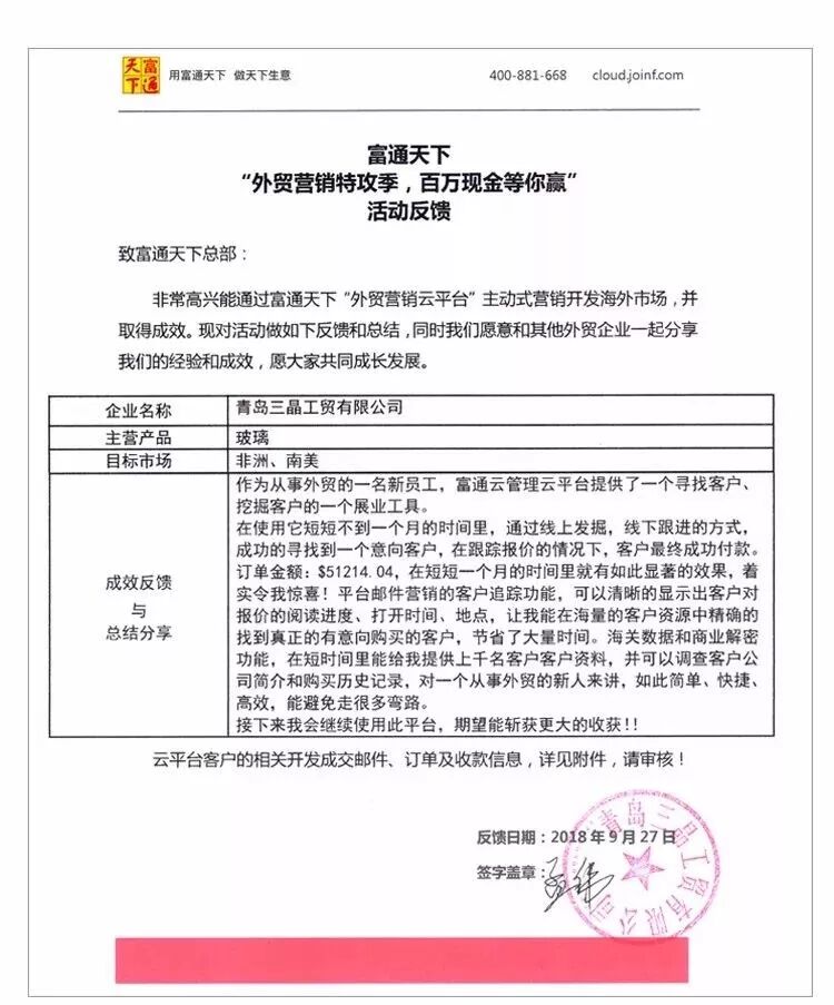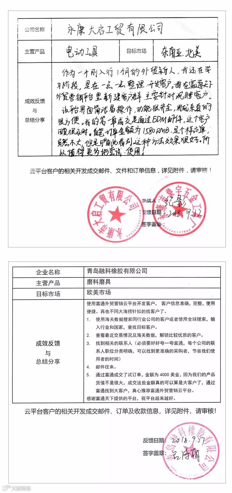 在随后的活动反馈中,众多胜出的参战业务员,纷纷表达了他们对营销云平台的感悟与收获:如“对我们外贸新人而言,富通天下云平台是个简单、快捷、高效的客户开发渠道”、“云平台的商业数据除了买家的基本信息,还有更重要的工作邮箱、社交账号,避免了我们走很多弯路!”、“相比于展会高昂的费用,外贸平台的‘鸡肋’效果,富通天下外贸营销云平台无疑给外贸人多了一个更佳选择”。