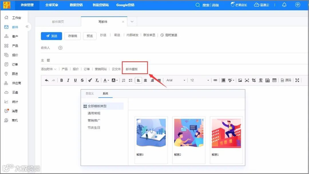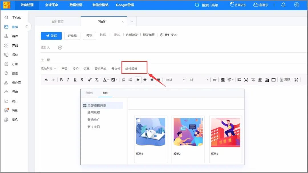 以上邮件内容都在富通天下云平台邮件模板中,外贸人直接套用邮件模板,给客户发去一封得体又高效的邮件,抢占营销先机。
