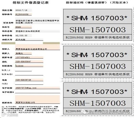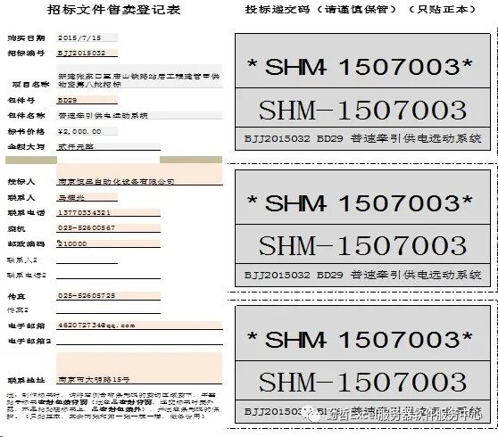 用于标书发售时厂家购买信息的登记,并打印出相关信息和条形码,要求供应商粘贴于标书密封包装外,条形码用于之后的标书递交环节使用扫码枪快递收