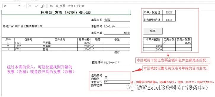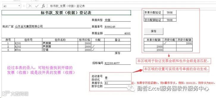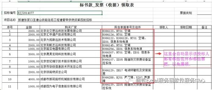 用于记录和分配财务开具的标书款发票或收据(有时候一张发票包含几个包件)