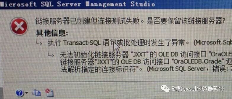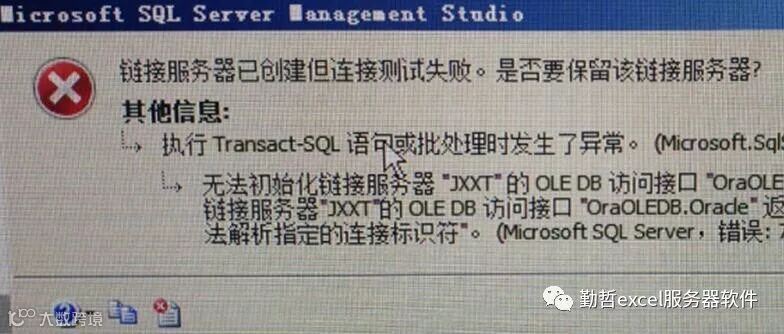 勤哲Excel服务器软件服务中心问题:在勤哲excel服务器中使用外部数据源的过程中,当在64位sql里面用链接服务器连接Oracle的时候,提示:无法解析指定的连接标识符。如下图: