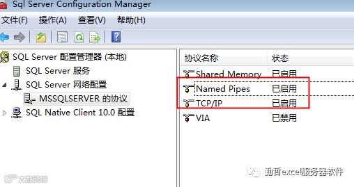 解决:打开Sql Server配置管理器,启用tcp/ip和命名管道即可。如下图: