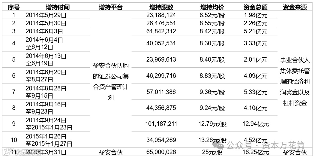 自2014年5月至2015年1月,事业合伙人作为劣后级资金通过盈安合伙发起的国信金鹏分级1号和2号集合资产管理计划累计购买万科A股股票4.96亿股,占当时公司总股本的4.39%。