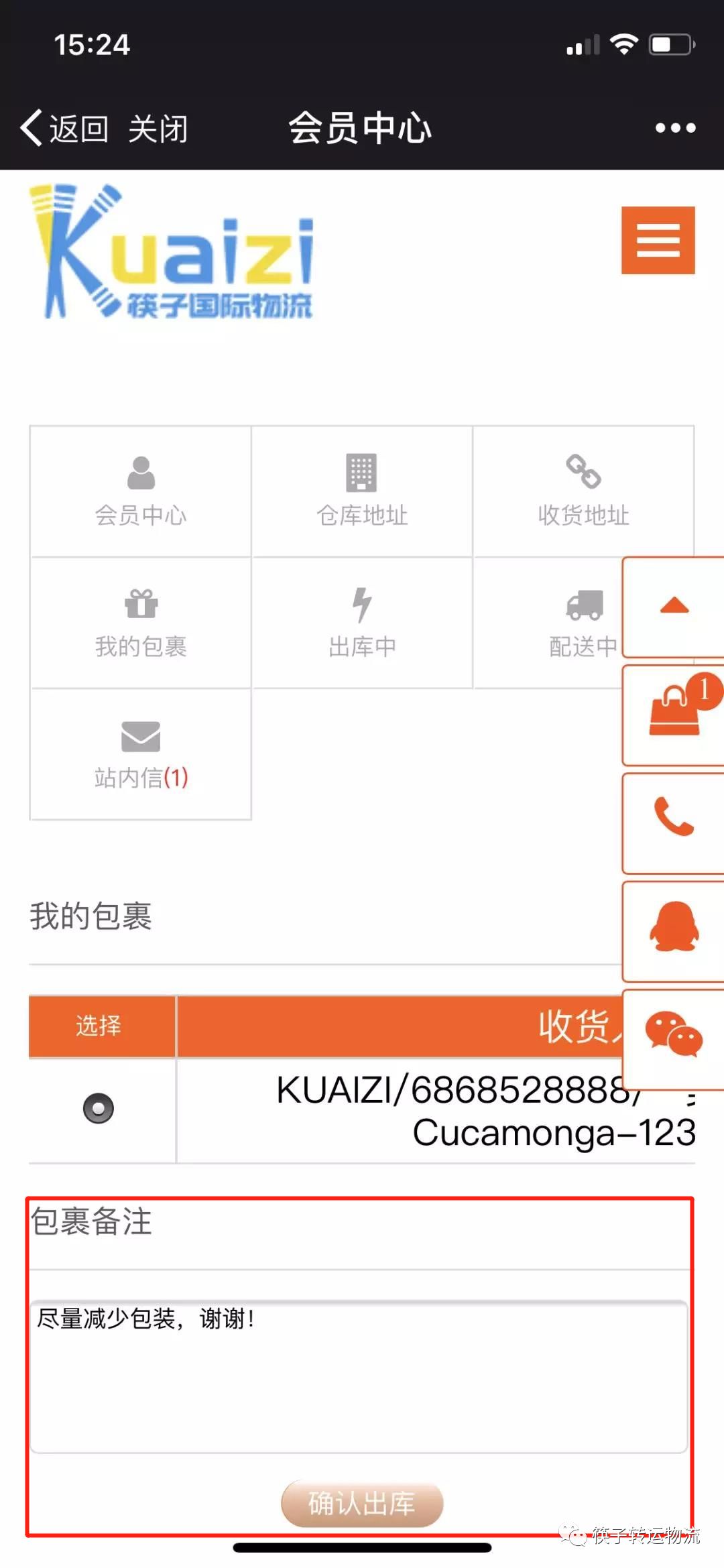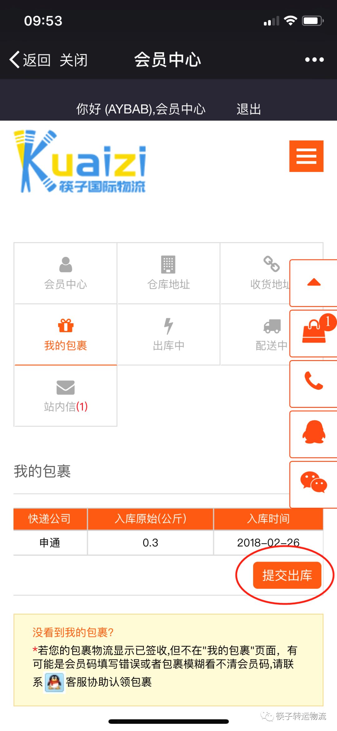 1. 勾选您要出库的包裹“提交出库”