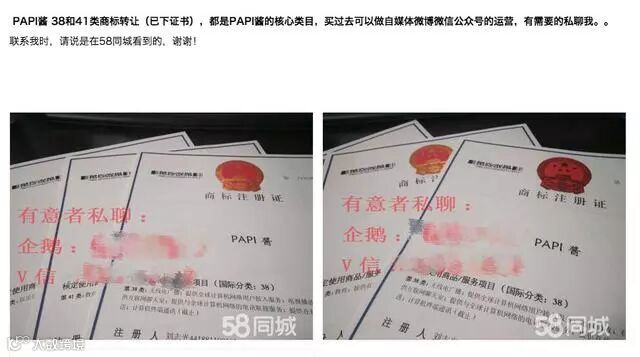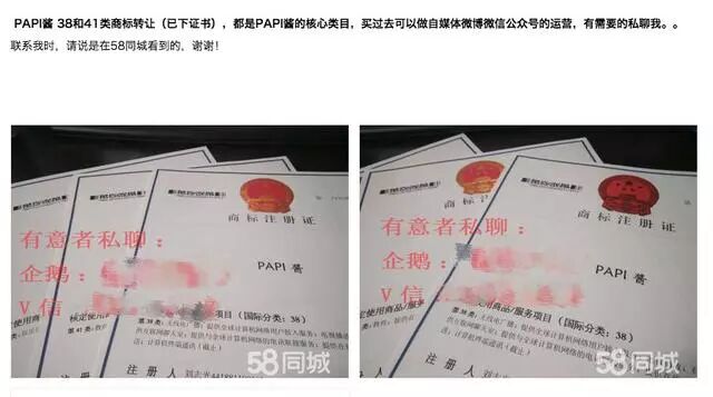 近日,经因短视频而走红的网红“papi酱”(真名姜逸磊)授权,泰洋川禾文化传媒徐州有限公司(后简称“泰洋川禾”)在多个商标类别上申请注册“papi酱”系列商标,但申请被商标评审委员会驳回,理由是“与其他商标构成近似”。后泰洋川禾不服,将商评委起诉到北京知识产权法院,但法院驳回了其请求。小编在58同城上看到,其中一个与此案有关的近似商标“PAPI酱”恰好正在拍卖。